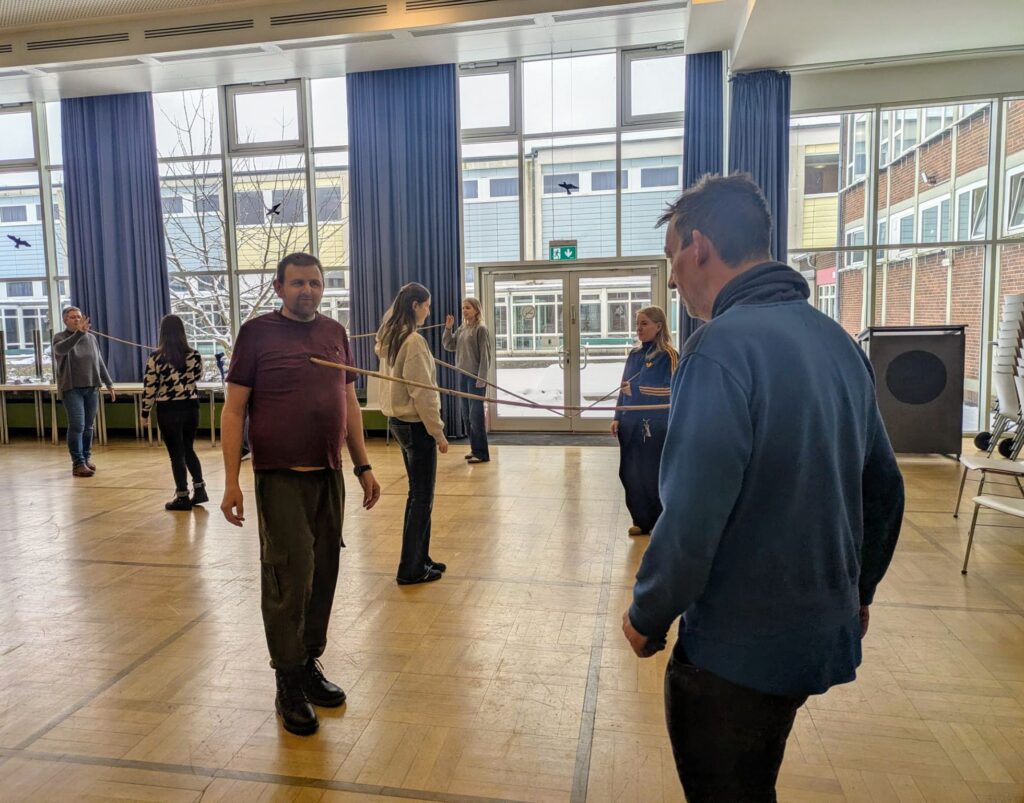 In vielen abwechslungsreichen Übungen ging es um Wahrnehmung, Vertrauen und das Miteinander. Daraus entstanden jeden Tag kleine Spielszenen in Gruppen. Es wurde viel gelacht, aber auch intensiv zugehört und ausprobiert. Besonders eindrücklich waren sinnliche Erfahrungen wie das Sich-führen-Lassen mit verbundenen Augen durch die Schule – Momente, die Mut erforderten und großes Vertrauen schufen.