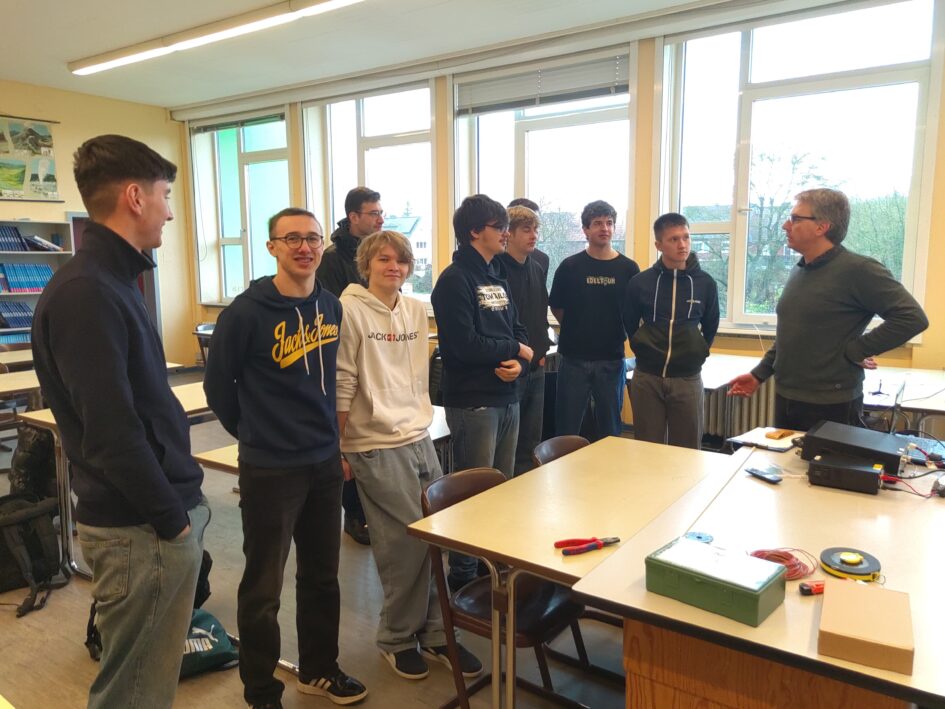 Am Montag, den 16. März, bekam der Physik-Leistungskurs 12 von Herrn Köhn besonderen Besuch: Herr Hänsel, Vater von Mattis Hänsel (Jg 13), kam in den Unterricht und brachte ein spannendes Projekt mit – den Bau einer Antenne für den Kurzwellenfunk (KW). Gemeinsam mit ihm bauten die Schüler Schritt für Schritt eine funktionierende Antenne auf und lernten dabei, wie Funkverbindungen über große Entfernungen möglich sind.